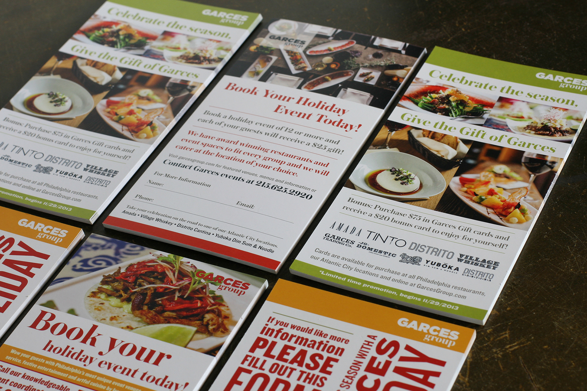 Seasonal check presenters that inform guests at Garces Group restaurants that they can book holiday parties, functions, and events. Check presenter also promotes giving Garces Group gift cards for the upcoming holidays.
