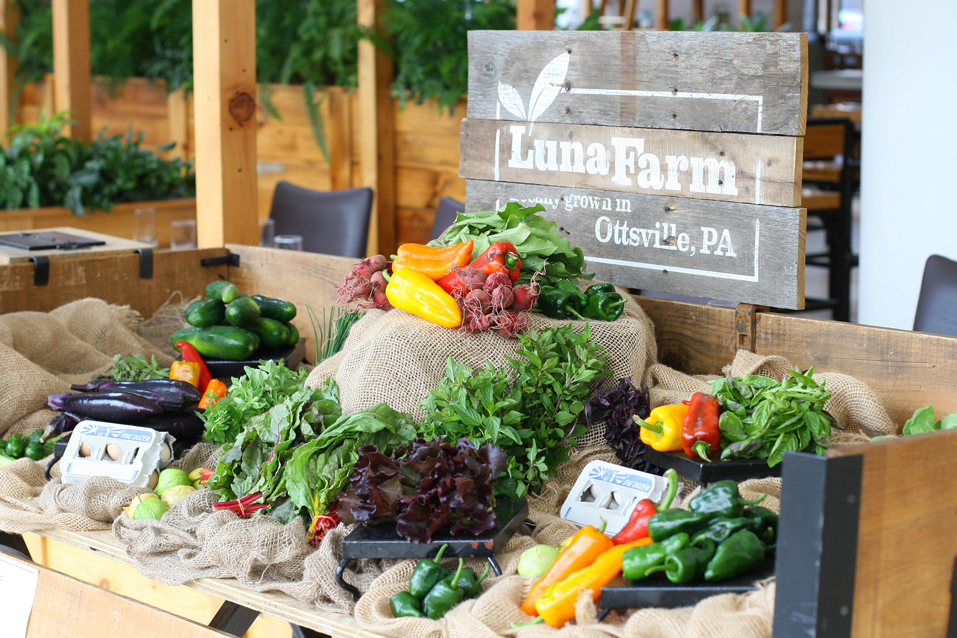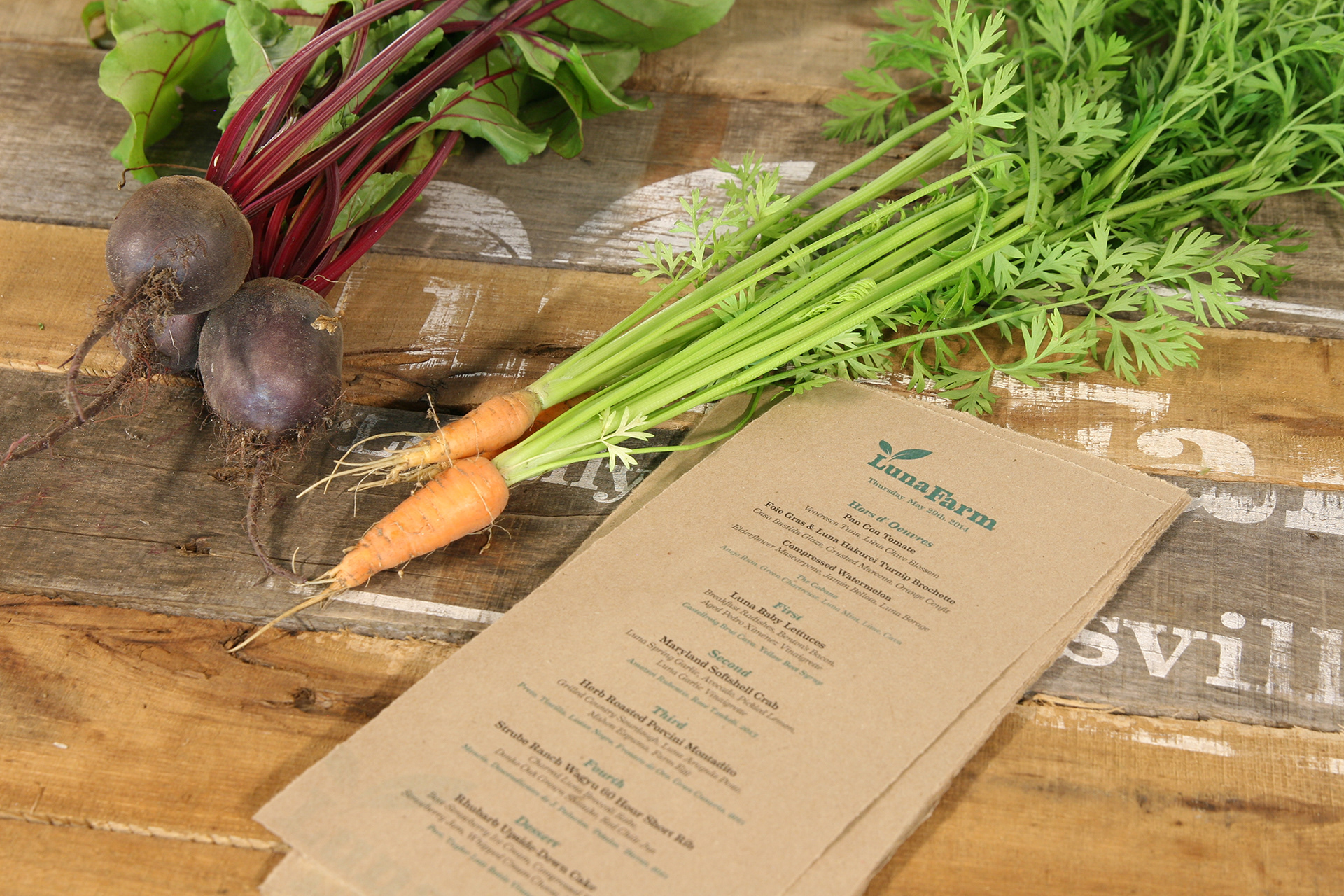 Custom screenprinted signage for the Luna Farm vegetable cart. The cart is located on the ground floor of The Cira Centre. To give the signage a "weathered farm look" the sign was made from repurposed pallet wood and recycled metal brackets. Logo and copy were screen printed directly onto the old wood. The ink was then sanded off in different areas to give a more weather beaten patina. The event menus were printed on recycled craft paper to give a more down to earth feel and look.