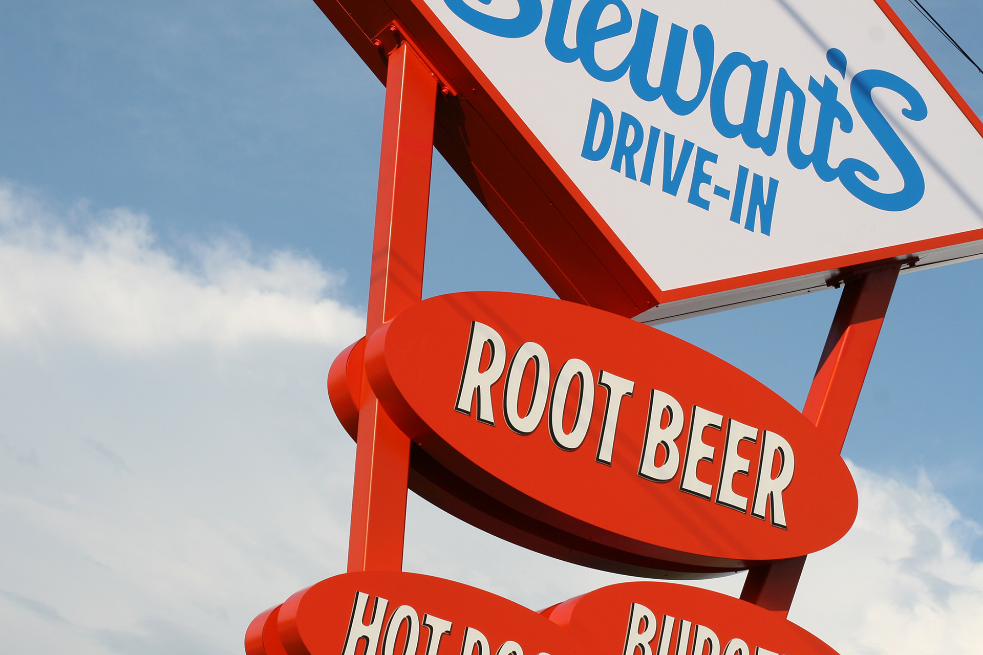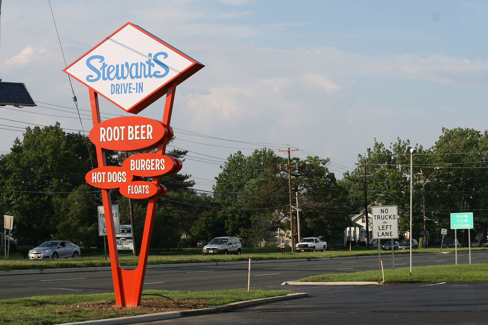 Custom sign design for Stewart's Drive-In Restaurant. Stewart’s Drive-In is a classic tray service style eatery that was once very popular in the road culture of Mid Century America. Located in Burlington, NJ Stewart's is one of the oldest independently owned car hop restaurants in the country. The new sign was designed to evoke the Mid Century Era and match the look and feel of the Stewart's freestanding car hop building.